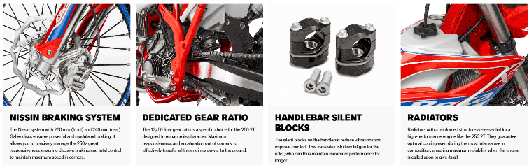The RX 250 2T engine is not an adjustment, but an entirely new design, developed with a single focus: competition in the MX2 Class. Every single element of the thermal unit has been designed for this engine; head, cylinder, crankshaft, crankcase, and so on. Nothing has been left to chance. The result is explosive power delivery and exceptional thrust at high revs, giving you the maximum advantage anytime, anywhere.