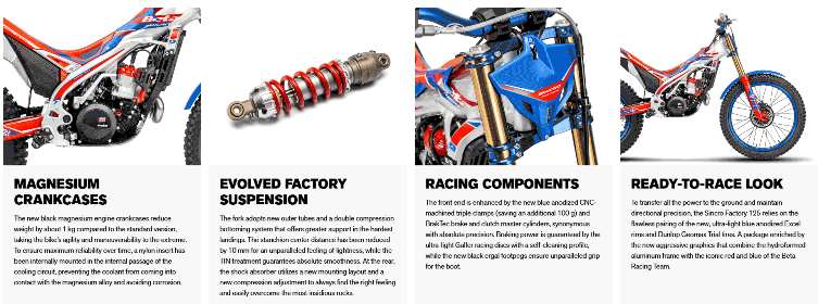 Every obstacle becomes an opportunity to push beyond your limits. On the Sincro Factory 2T 125, every single gram has been optimized to offer maximum harmony of movement: from the CNC-machined triple clamps to the extensive use of magnesium and titanium, experience a level of millimeter precision and an unparalleled feeling. For a total and direct connection between the bike, the rider, and the terrain.